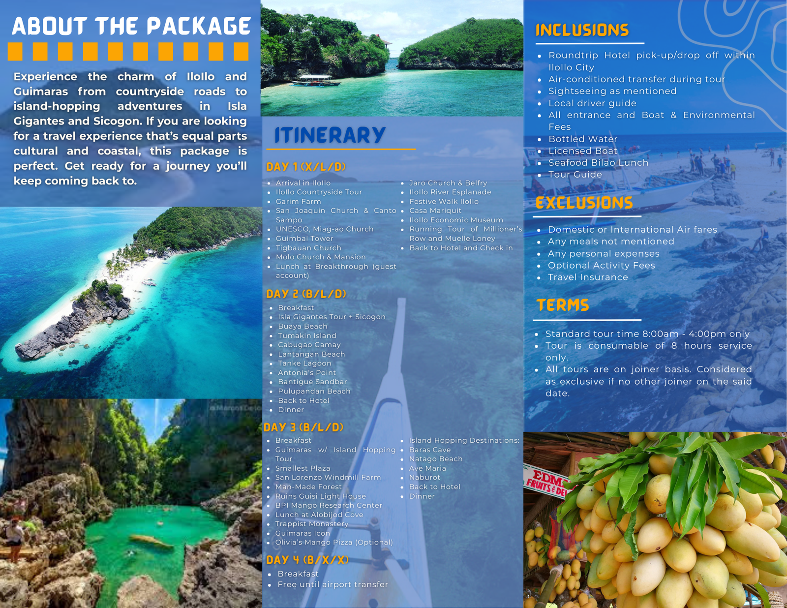 Experience the charm of Ilo-Ilo and Guimaras from countryside roads to island-hopping adventures in Isla Gigantes and Sicogon. If you are looking for a travel experience that’s equal parts cultural and coastal, this package is perfect. Get ready for a journey you’ll keep coming back to.